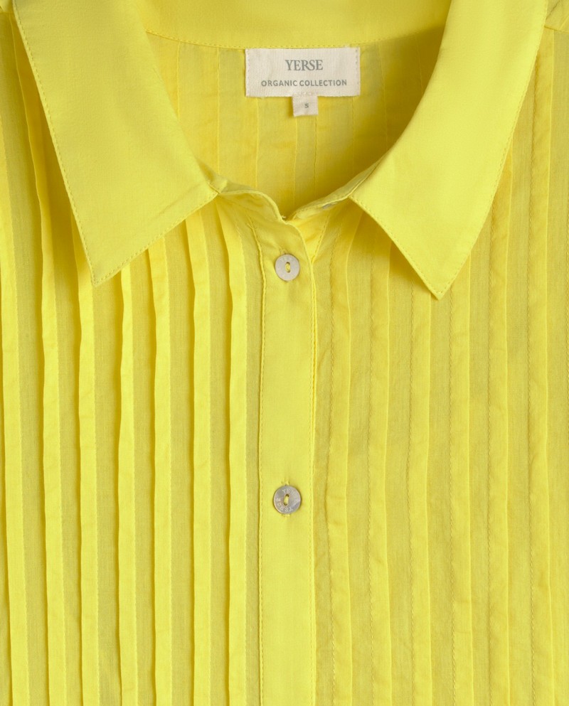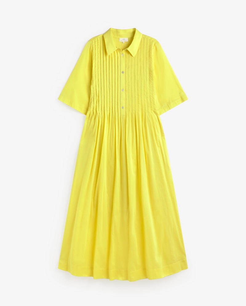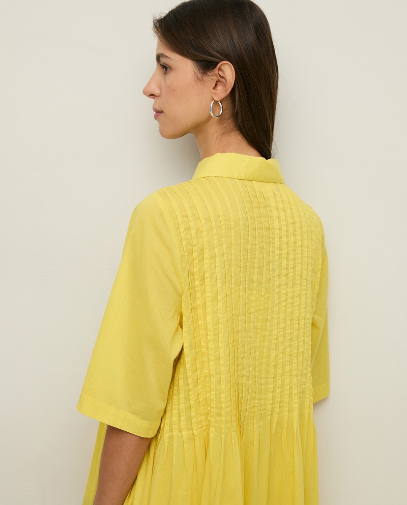 Žluté midi šaty s krátkým rukávem. Vyrobeno z organické bavlny. Volný střih. Klasický košilový límec a zapínání na knoflíky. Na hrudi záševky. Mírně rozšířená sukně. Dvě boční kapsy. Boční rozparky. Podšívka. Délka od ramene: 128 cm (velikost S).