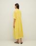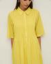Žluté midi šaty s krátkým rukávem. Vyrobeno z organické bavlny. Volný střih. Klasický košilový límec a zapínání na knoflíky. Na hrudi záševky. Mírně rozšířená sukně. Dvě boční kapsy. Boční rozparky. Podšívka. Délka od ramene: 128 cm (velikost S).