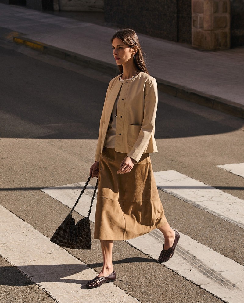 Bunda z ovčí kůže v ecru barvě. Standardní střih. Kulatý výstřih. Skryté zapínání na druk a dvě přední nakládané kapsy. Celá podšitá. Délka od ramene: 59 cm (velikost S).
