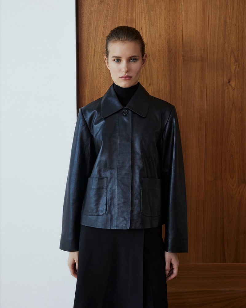 Krátká bunda ze 100% kůže napa. Regular střih. Podšívka. Límec. Dlouhé rukávy. Zapínání na druk pod klopou. Viditelný knoflík u krku. Dvě přední nakládané kapsy.