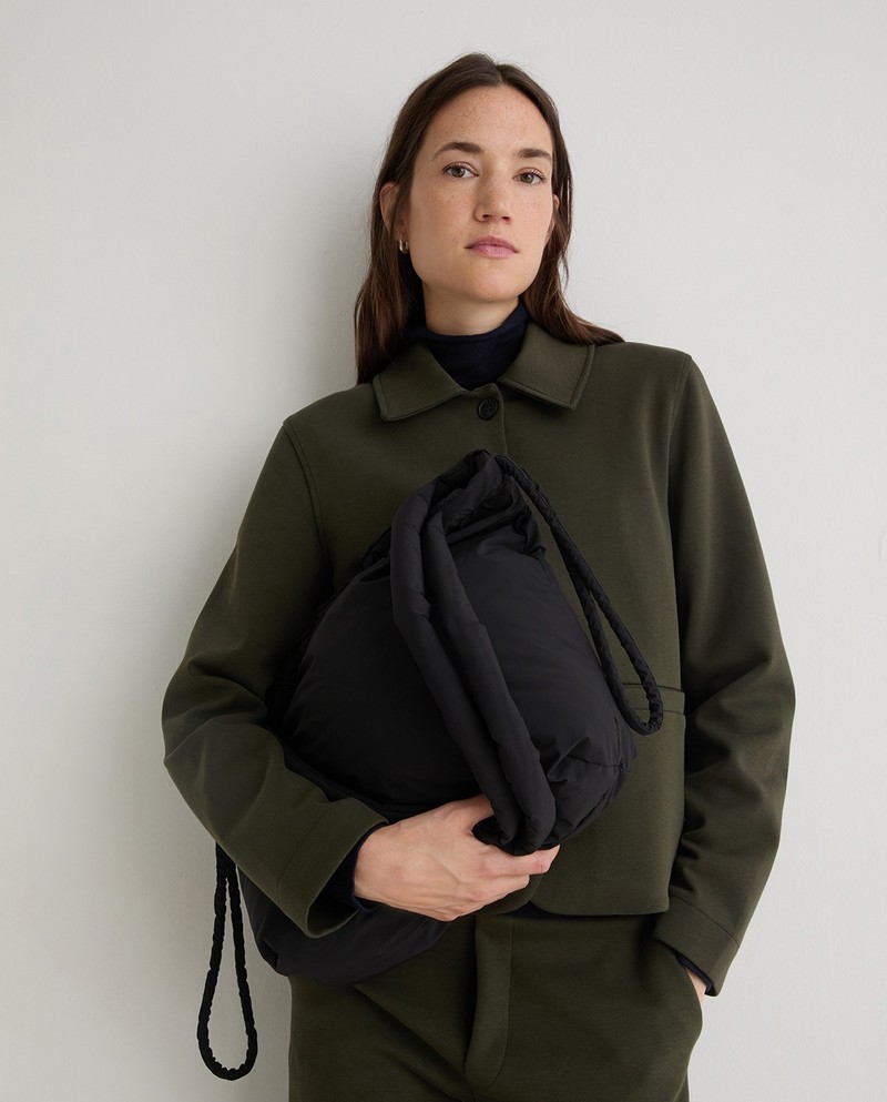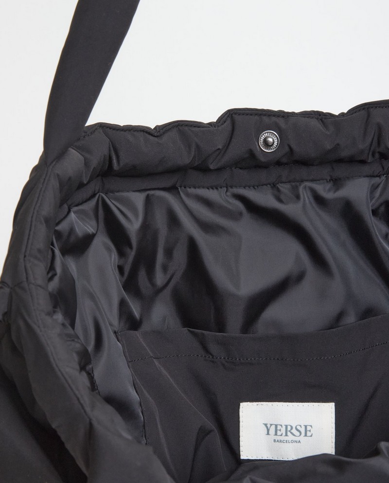 Prošívaná taška do kbelíku. Vyrobeno z recyklovaných vláken. S podšívkou. 2 ramenní popruhy. Zapínání na druk a nastavitelné popruhy. Vnitřní kapsa.