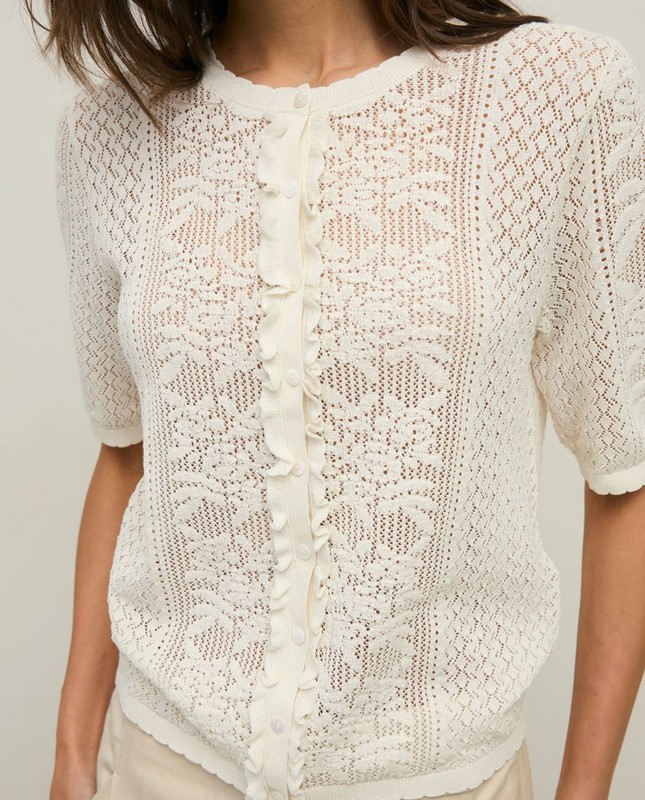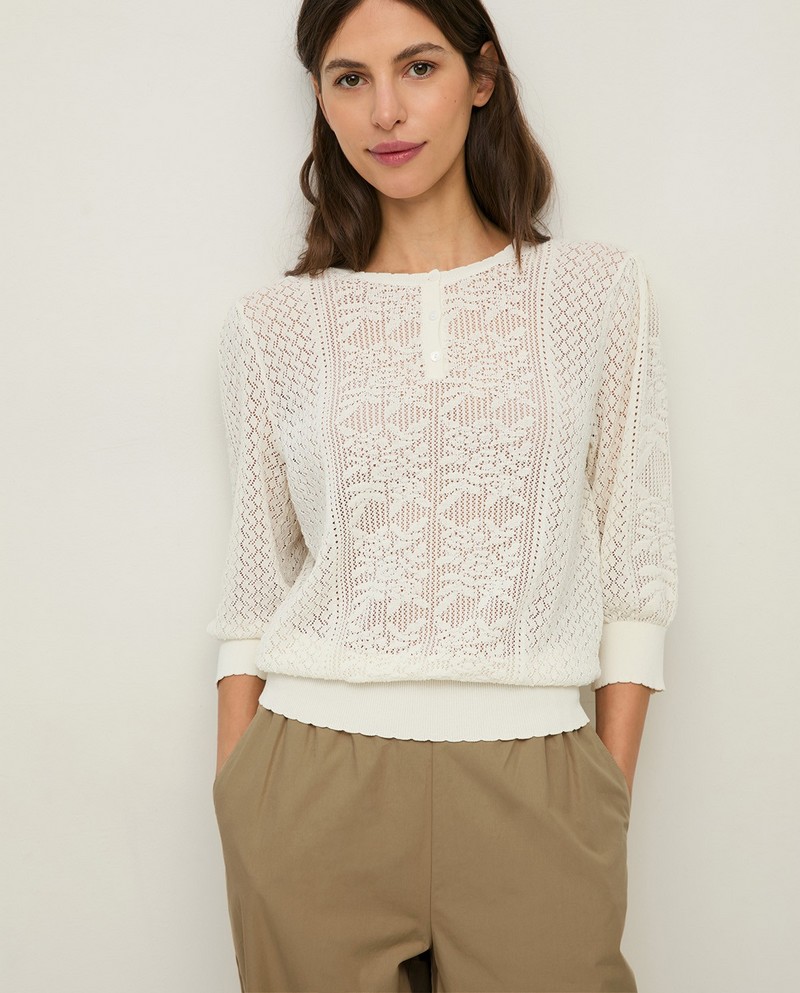 Bílý pletený svetr s nafoukanými tříčtvrtečními rukávy. Kulatý výstřih s knoflíky. Prolamovaný vzor s knoflíky vpředu a žebrovaným lemem. Vyrobeno z bavlněné směsi. Jemná hustota. Délka od ramene: 57 cm (velikost S).