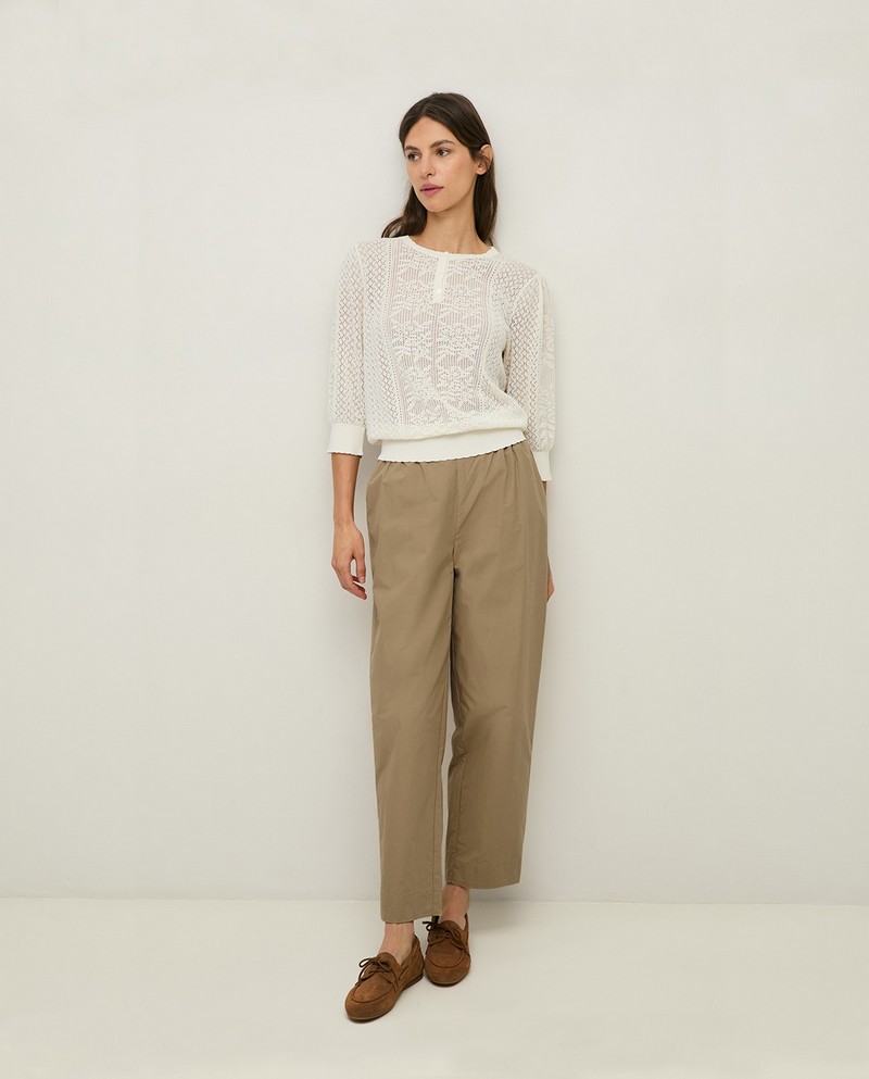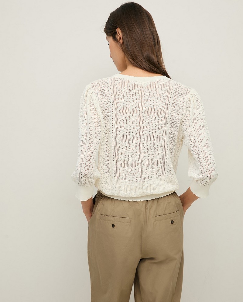 Bílý pletený svetr s nafoukanými tříčtvrtečními rukávy. Kulatý výstřih s knoflíky. Prolamovaný vzor s knoflíky vpředu a žebrovaným lemem. Vyrobeno z bavlněné směsi. Jemná hustota. Délka od ramene: 57 cm (velikost S).