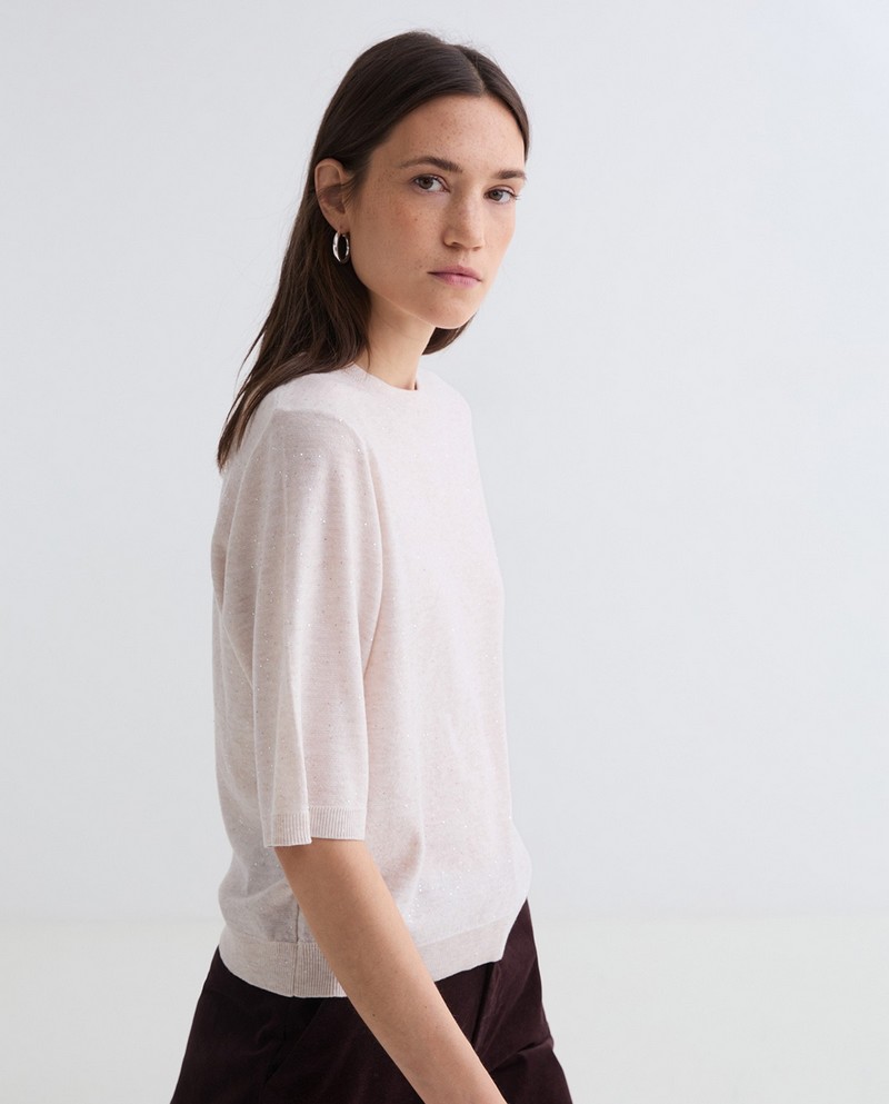 Svetr s francouzskými rukávy. Směs vlny. Kulatý výstřih. Žebrované detaily. Mini flitry a lurex. Kapkovitý zadní díl.