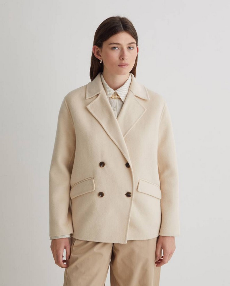 Krátká dvouřadá bunda. Oboustranná směs vlny a recyklovaných vláken. Bez podšívky. Běžný střih. Klopy. Dlouhé rukávy. Dvouřadé zapínání. Dvě přední kapsy s klopou.