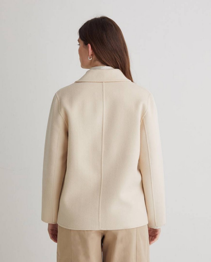 Krátká dvouřadá bunda. Oboustranná směs vlny a recyklovaných vláken. Bez podšívky. Běžný střih. Klopy. Dlouhé rukávy. Dvouřadé zapínání. Dvě přední kapsy s klopou.