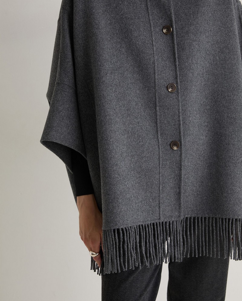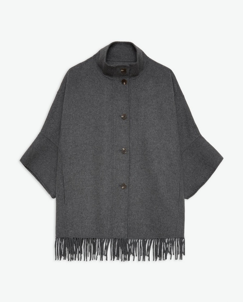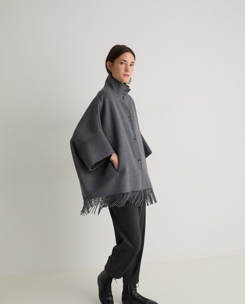 Ručně šitý šedý plášť ze směsi vlny s třásněmi