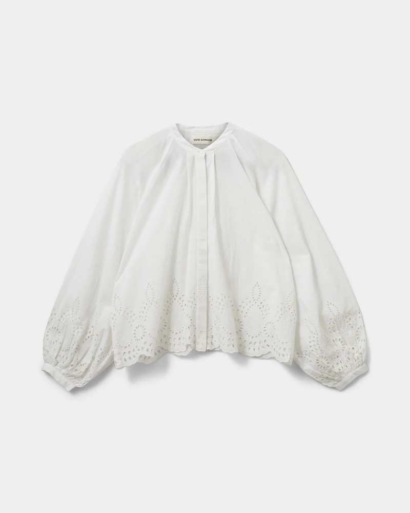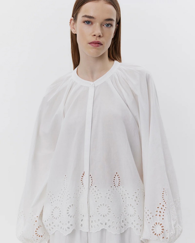 Bílá košile s výšivkou pointelle na okraji a na rukávech.