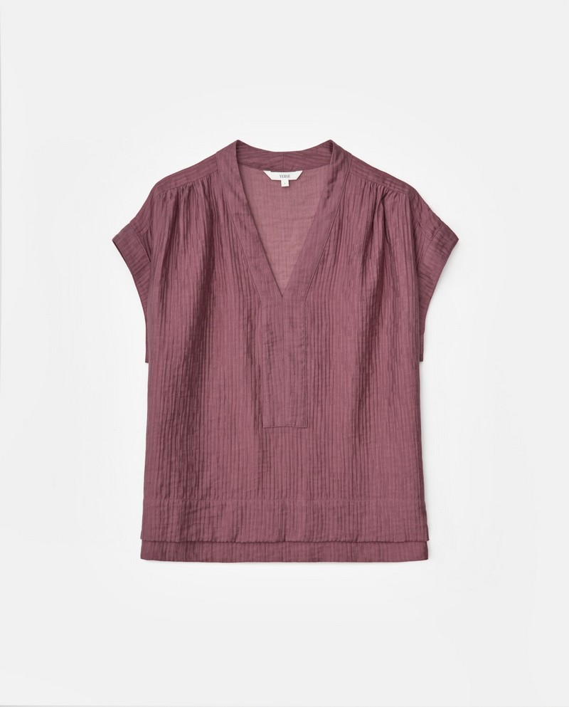 Halenka s vlnitým efektem. Směs viskózy a lyocellu. Výstřih do V. Krátké rukávy. Spuštěné rukávy. Boční rozparky na lemu.