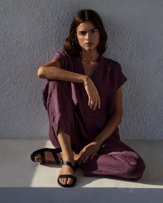 Halenka s vlnitým efektem. Směs viskózy a lyocellu. Výstřih do V. Krátké rukávy. Spuštěné rukávy. Boční rozparky na lemu.