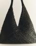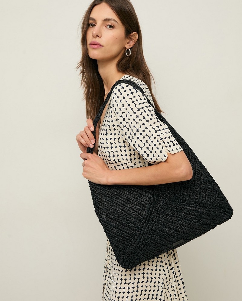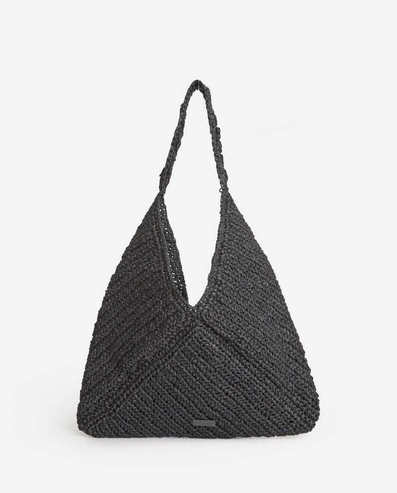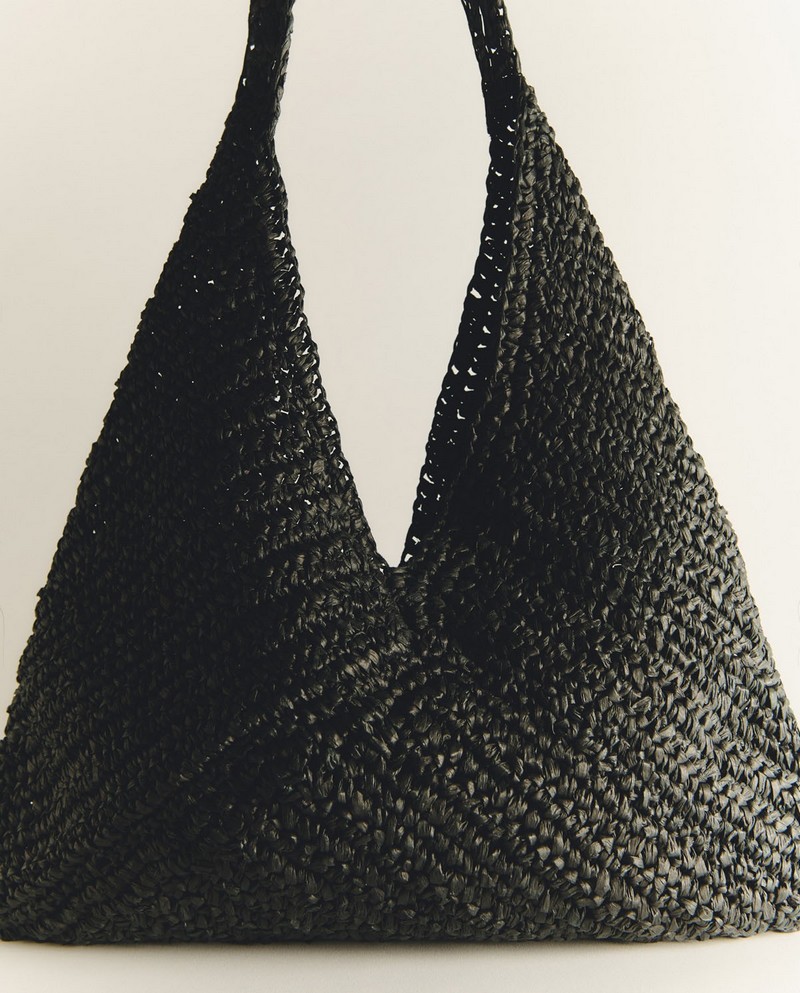Černá kabelka hobo. Vyrobeno ze 100% přírodní rafie. Pletená úprava a trojúhelníkový tvar. Podšívka na zip. Dva ramenní popruhy. Logo Yerse na přední straně. Rozměry: 42 x 42 x 3 cm. Popruh: 25 cm