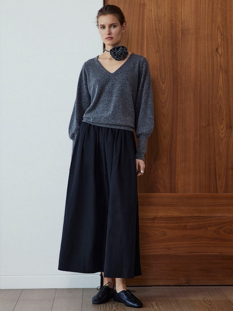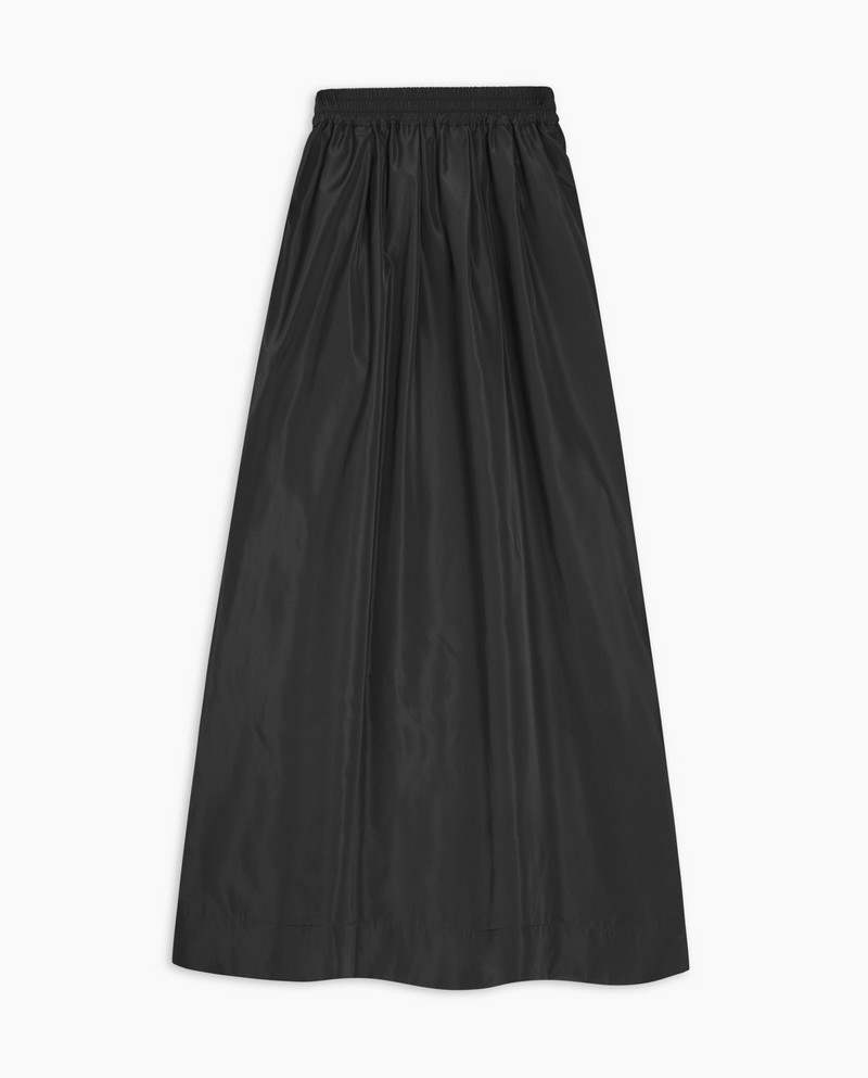 Satén midi sukně. Splývavý střih. Elastický pas. Dvě boční kapsy.