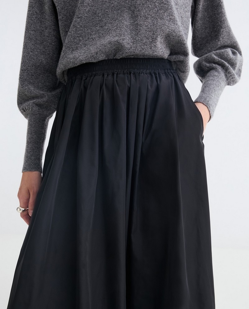 Satén midi sukně. Splývavý střih. Elastický pas. Dvě boční kapsy.