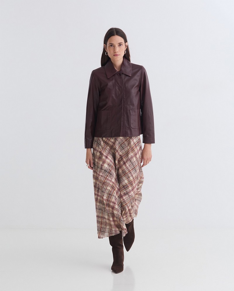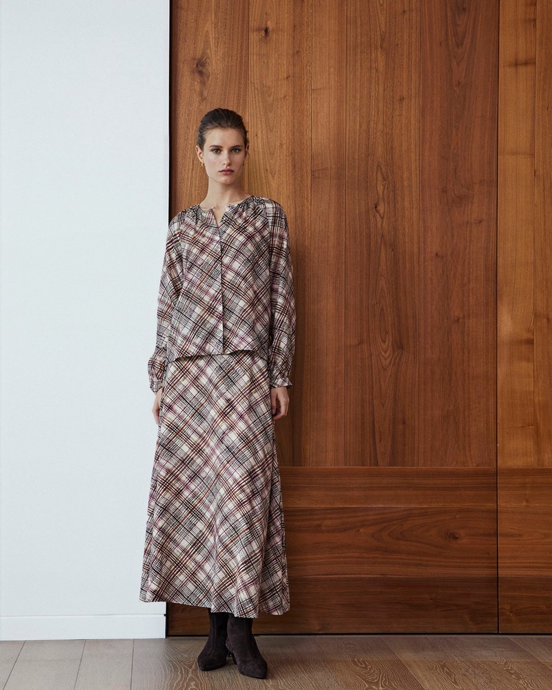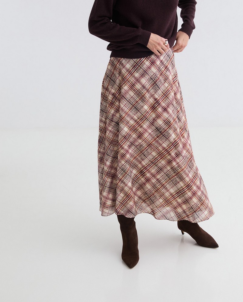 Kostkovaná midi sukně s potiskem. Viskózová gáza. Podšívka. Splývavý střih. Zapínání na zip na boku.
