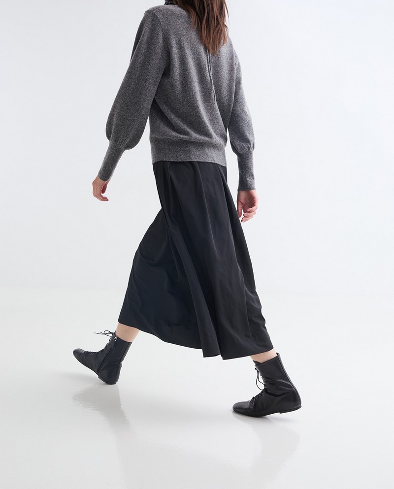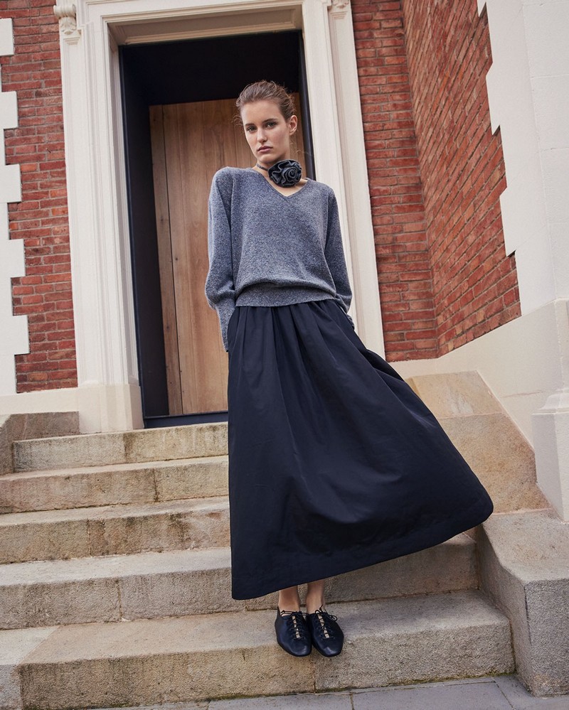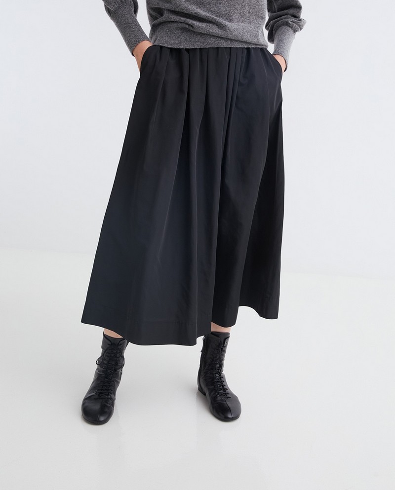 Satén midi sukně. Splývavý střih. Elastický pas. Dvě boční kapsy.