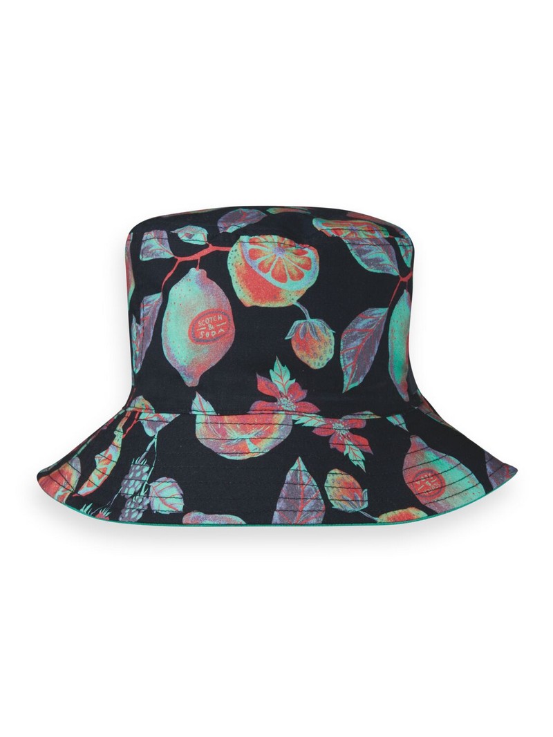 Tento oboustranný bucket klobouk ukazuje dva pohledy v jednom, přičemž jedna strana má jednobarevnou stranu a druhá hravý potisk.