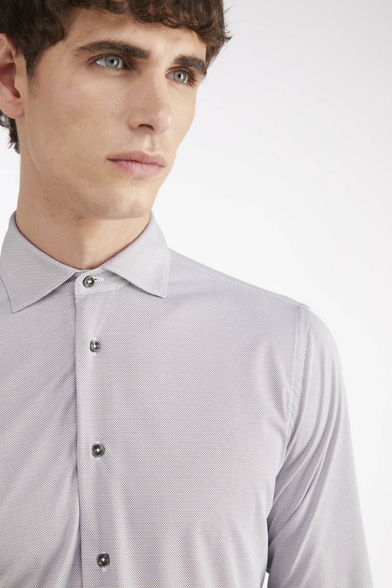 Košile z strečové tkaniny s potiskem, pohodlná, prodyšná a nežehlivá. Má francouzský límec s klopami, dlouhé rukávy a zapínání na knoflíky vpředu. Ideální pro elegantní a zároveň praktický vzhled.