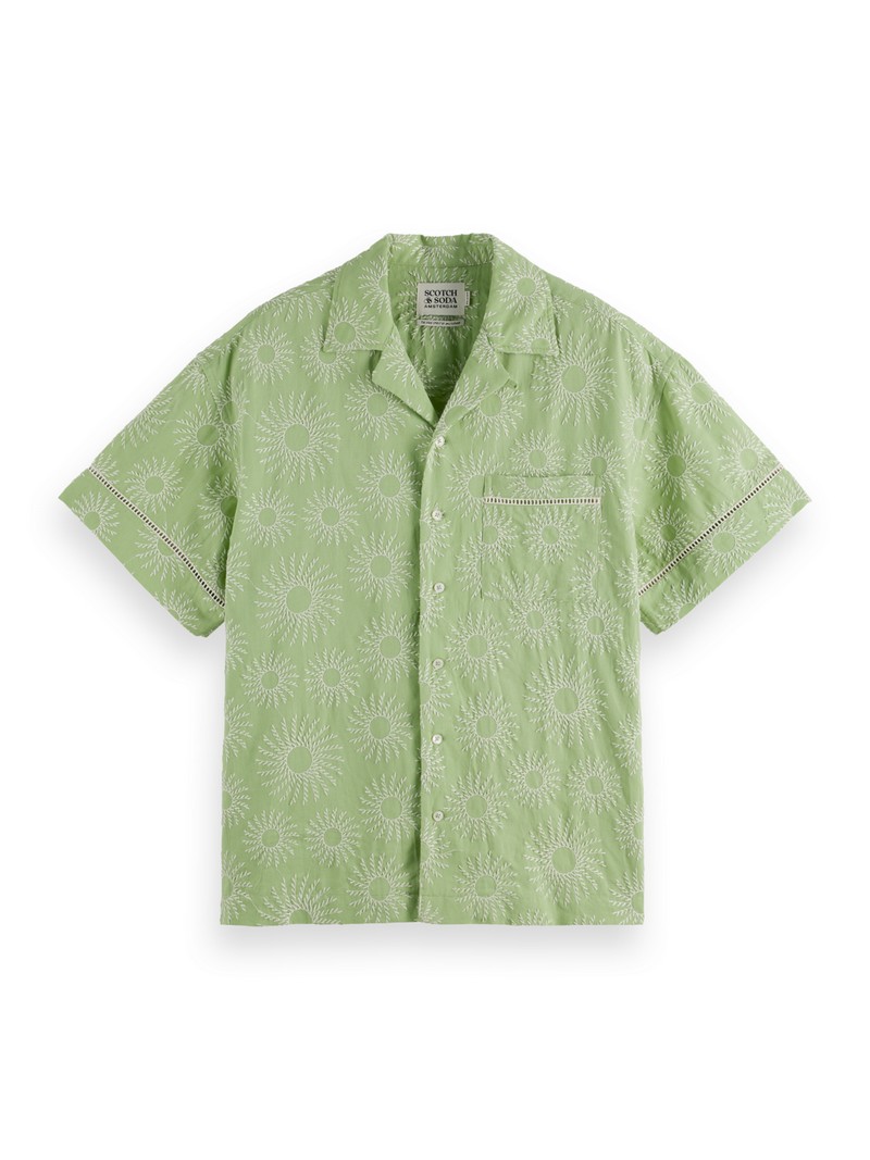 tato košile ze směsi lnu s krátkým rukávem má celoplošný potisk s jemnou výšivkou pro jedinečný texturovaný povrch.