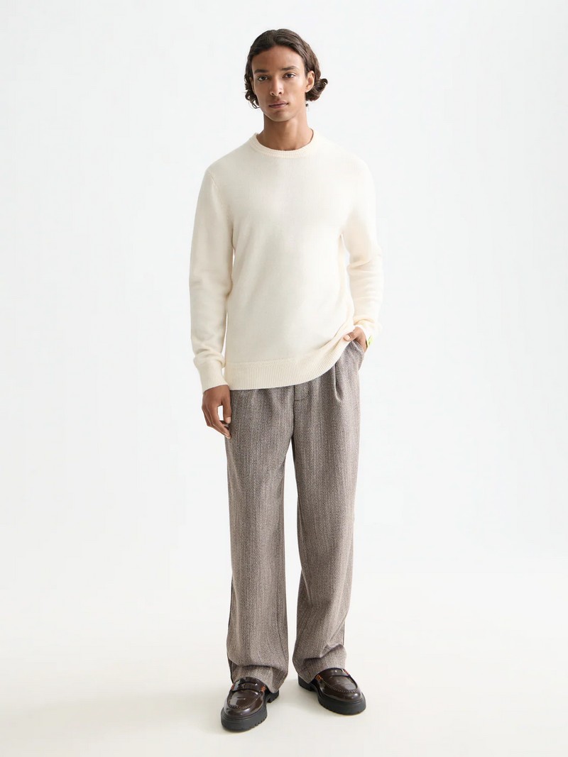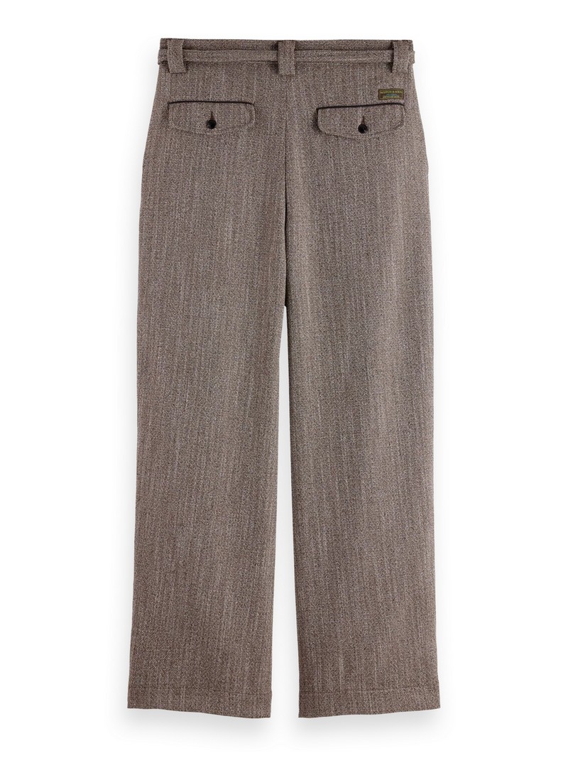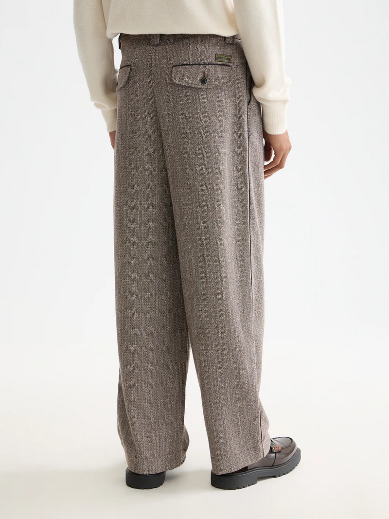 Plisované chino kalhoty baggy střihu z barvené příze s motivem rybí kosti, zakončené sklady a zavazováním.