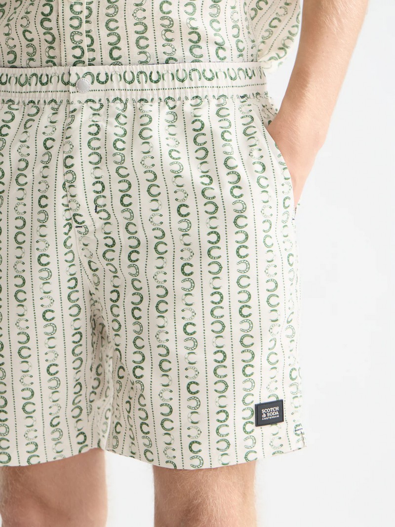 Plavecké kraťasy střední délky s potiskem, volným střihem a rafinovaným vzorem po celé délce pro nenucený styl za slunečného dne.