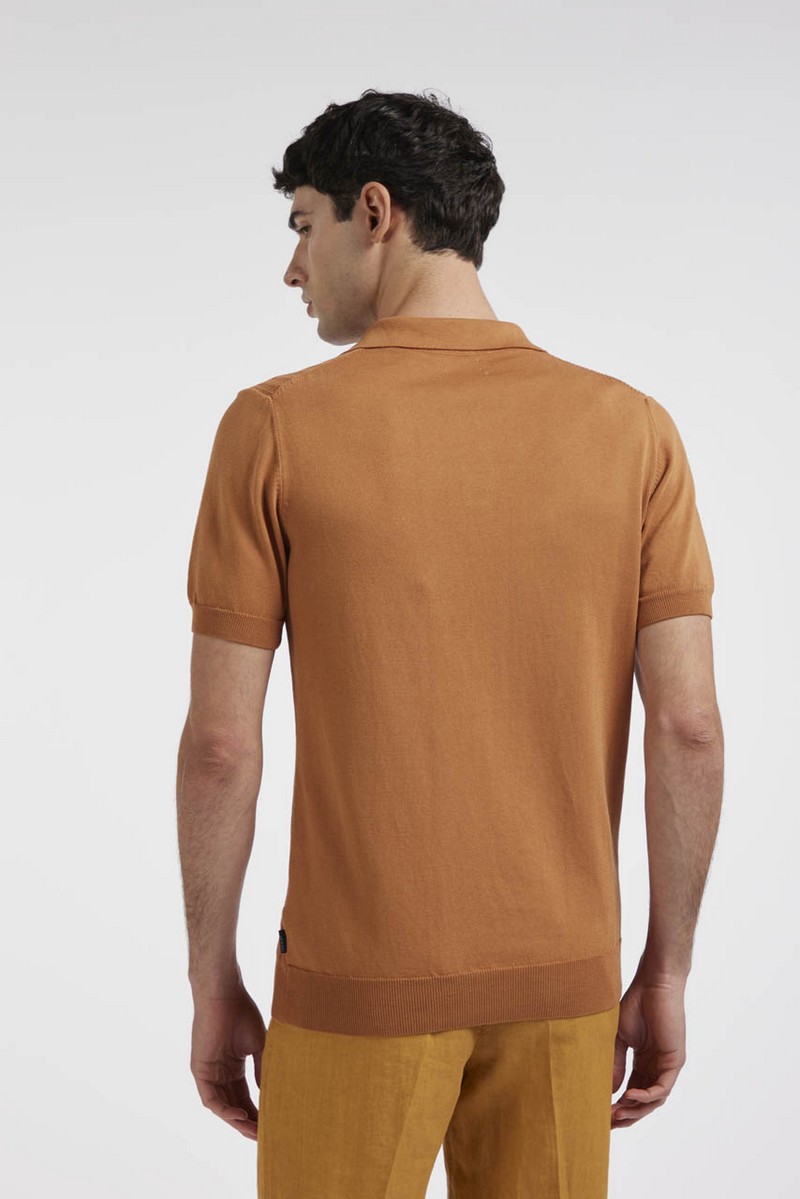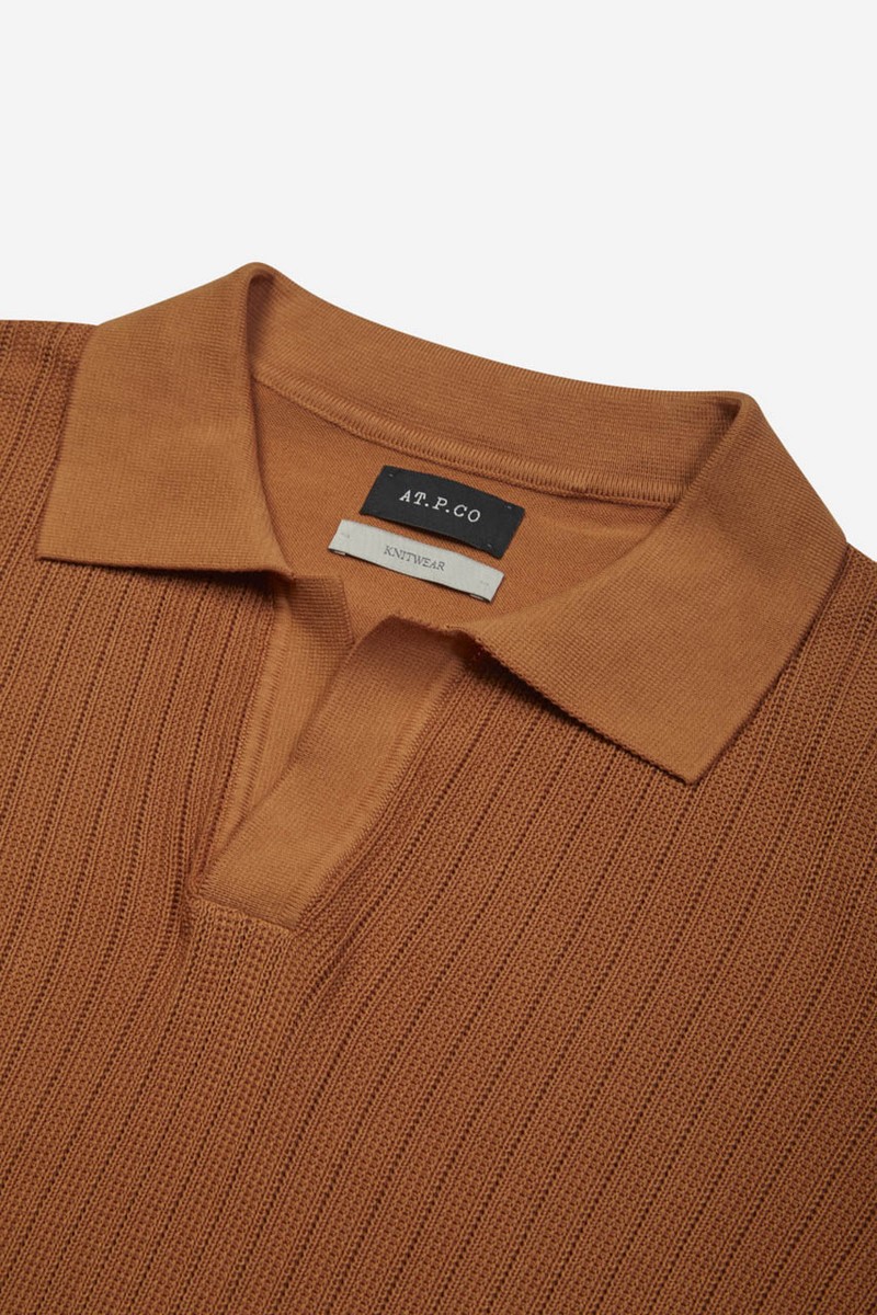 Bavlněné pletené polo tričko s žebrovaným předním dílem, který dodává tričku texturu a charakter. Krátký rukáv, límeček bez knoflíků a žebrované detaily ve spodní části a na rukávech.