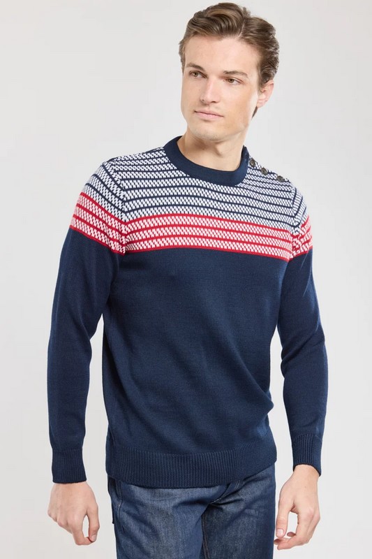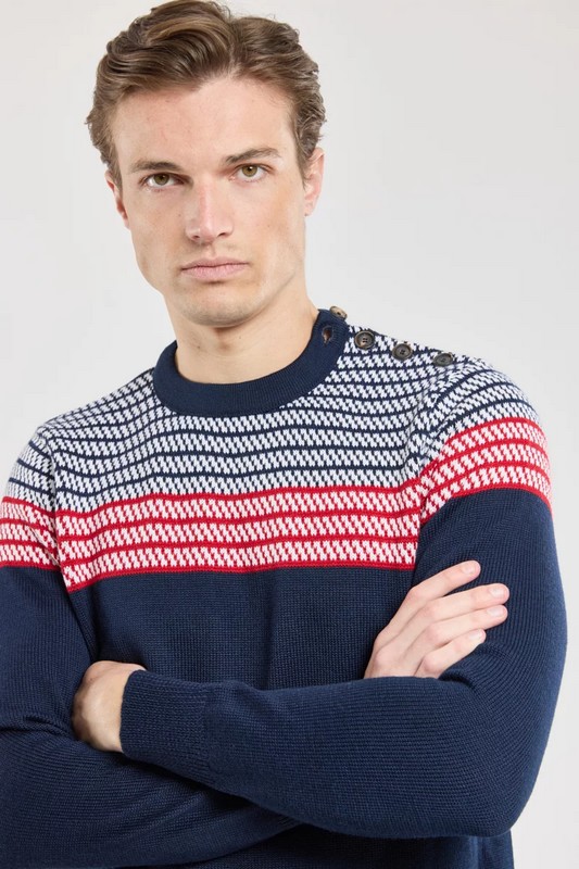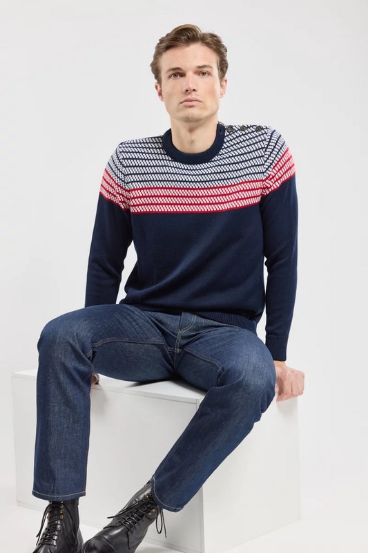 Le tricot effet “cordage” sur le haut de ce pull lui apporte toute son originalité sur une coupe classique.