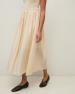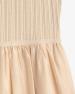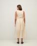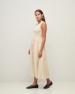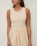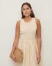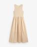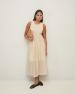 Maxi šaty bez rukávů v ecru barvě. Střih do tvaru áčka. Smíšená látka: Pletený top a dlouhá tkaná sukně s volány. Kulatý výstřih. Podšitá sukně. Střední gramáž. Délka od ramen: 122 cm (velikost S).