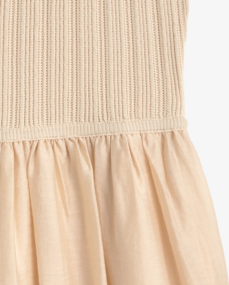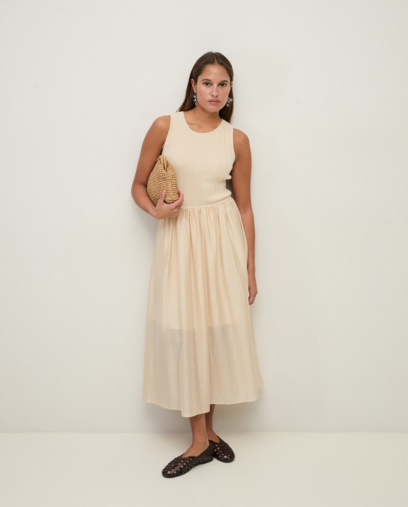 Maxi šaty bez rukávů v ecru barvě. Střih do tvaru áčka. Smíšená látka: Pletený top a dlouhá tkaná sukně s volány. Kulatý výstřih. Podšitá sukně. Střední gramáž. Délka od ramen: 122 cm (velikost S).