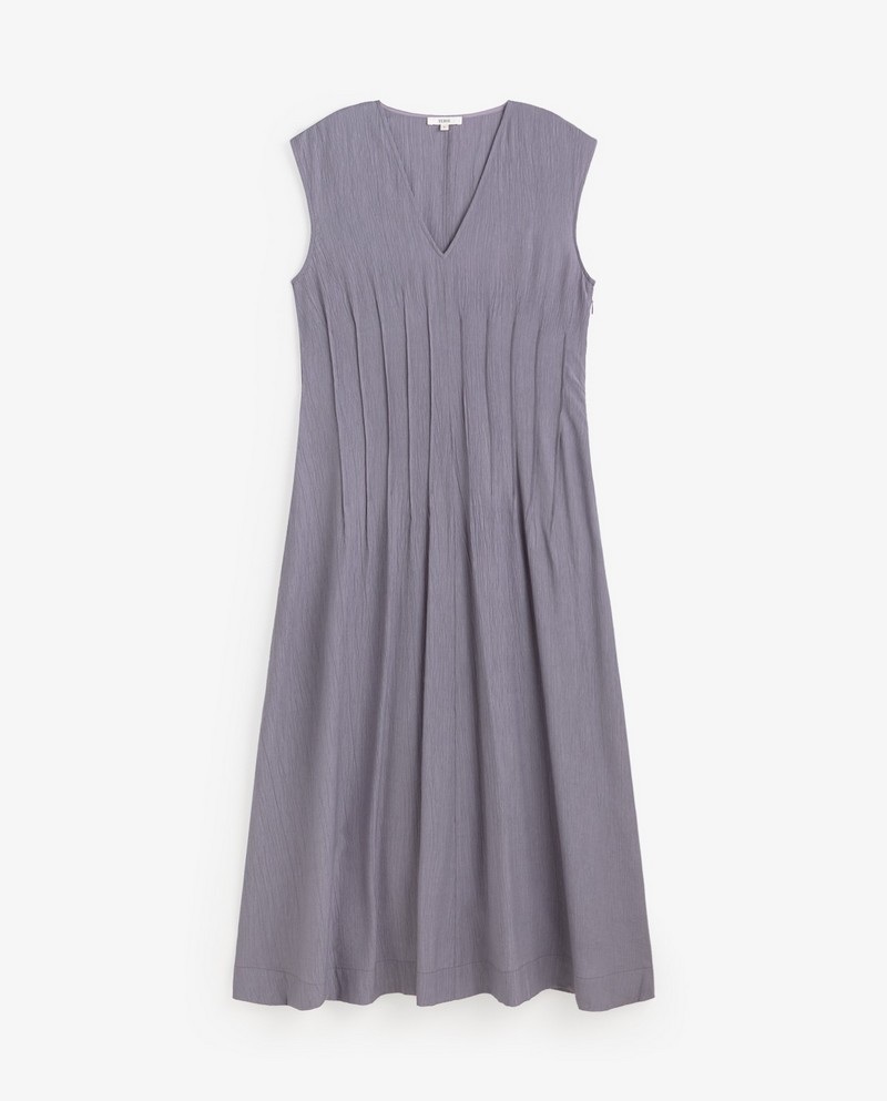 Dlouhé šaty bez rukávů v fialové barvě. Vyrobeny z lehké, splývavé látky. Regular střih. Výstřih do V a áčkový střih. V pase svislé stahovací šňůrky. Boční zip a zapínání na kovový háček. Délka od ramene: 133 cm (velikost S).