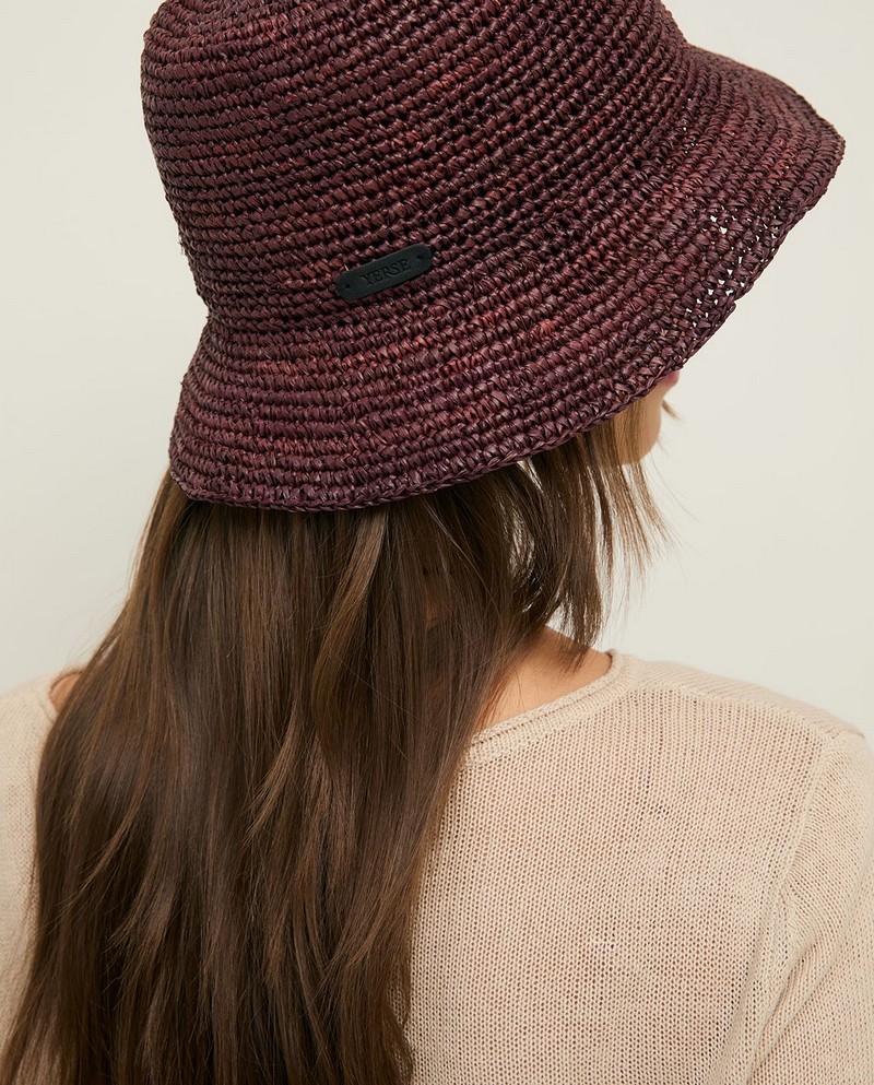 Sombrero typo bucket de rafia natural, un material ligero, transpirable y con textura artesanal. Diseño de ala corta y forma redondeada. Detailní logo Yerse. Diseño en color chocolate.