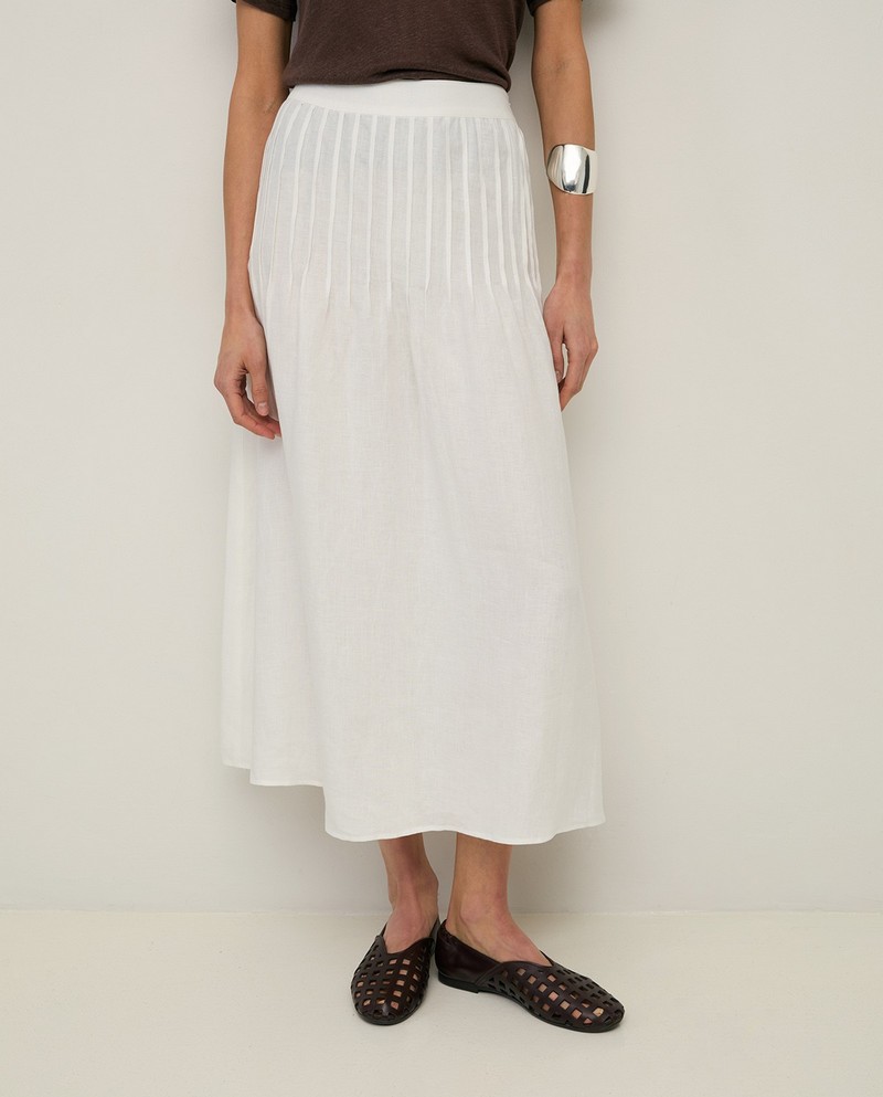Dlouhá bílá sukně. Vyrobeno ze 100% konopí. Regular střih. Boční zapínání na zip. Skládaný detail v bocích. Délka: 88 cm (velikost S).