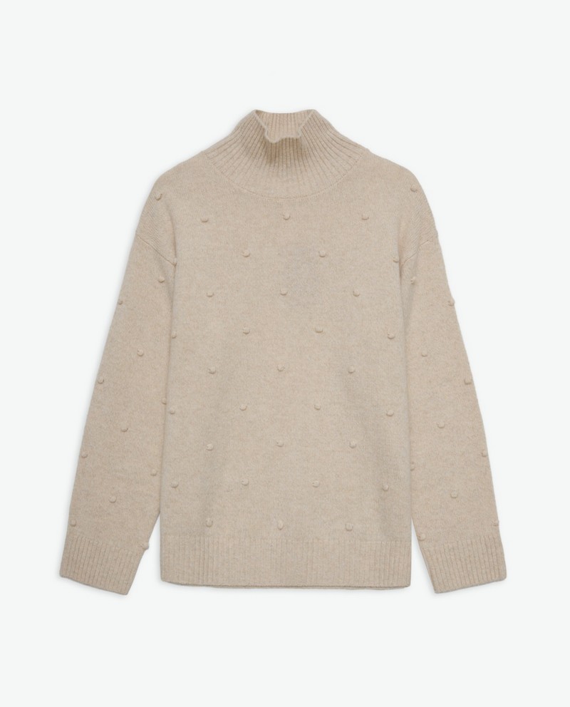 Svetr vyrobený z vlny RWS a recyklovaných vláken. Regular střih. Vysoký límec. Dlouhé rukávy. Bambulky. Boční rozparky. Žebrované detaily.