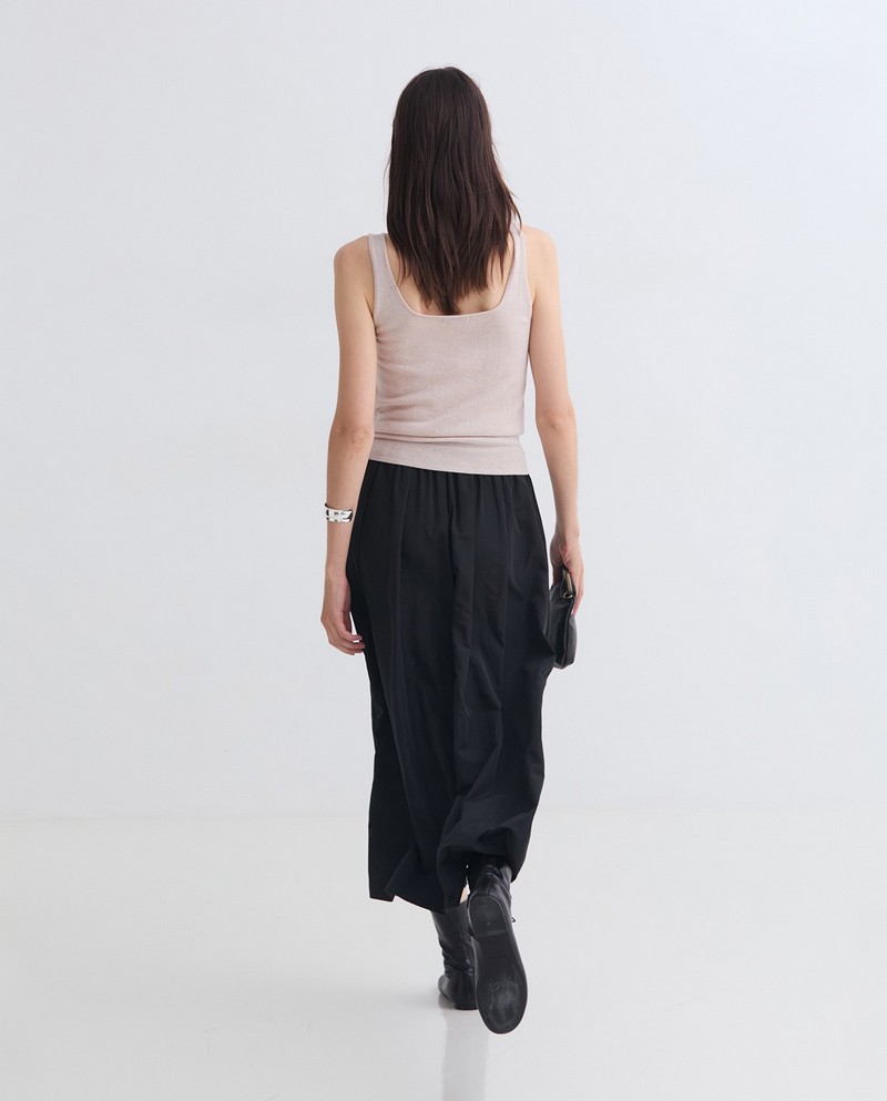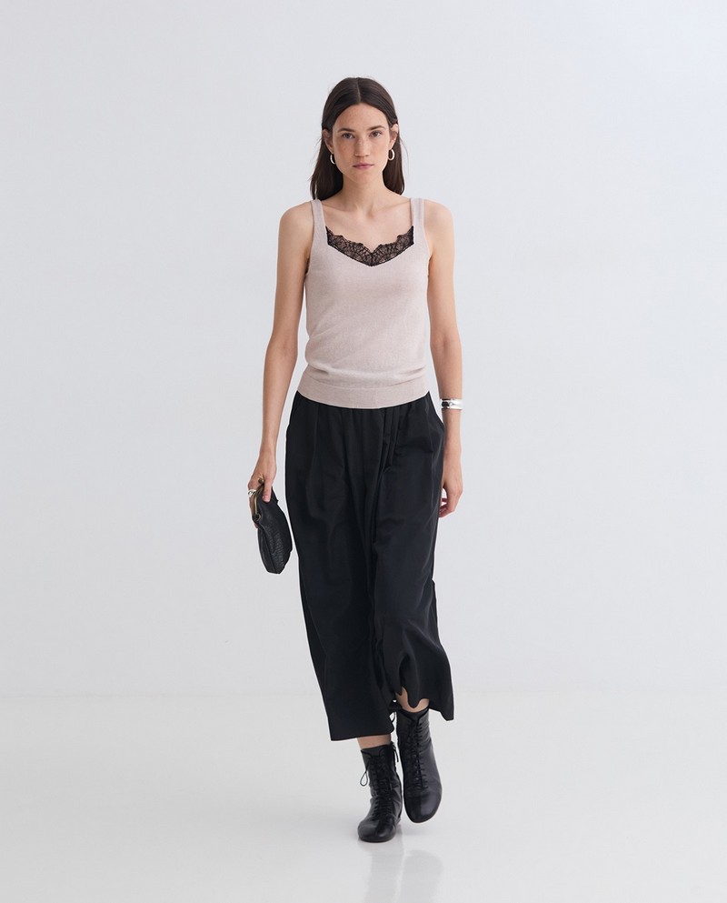 Regular střih. Výstřih do V. Bez rukávů. Krajkový akcent. Žebrovaný lem.